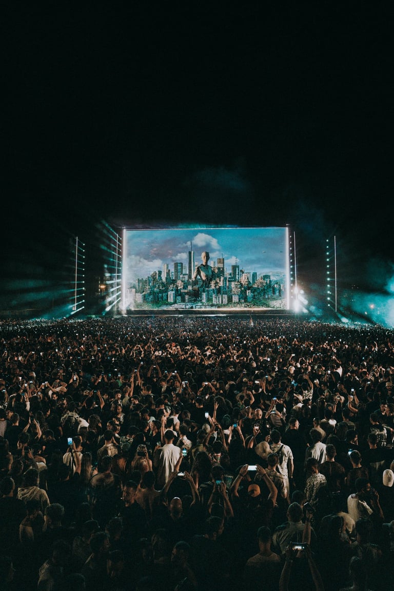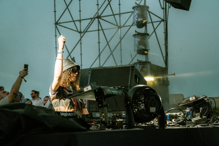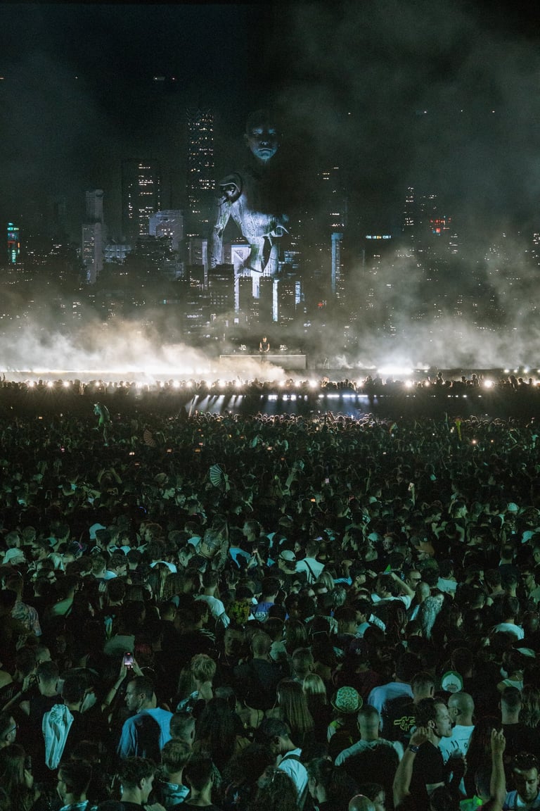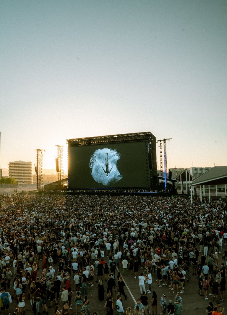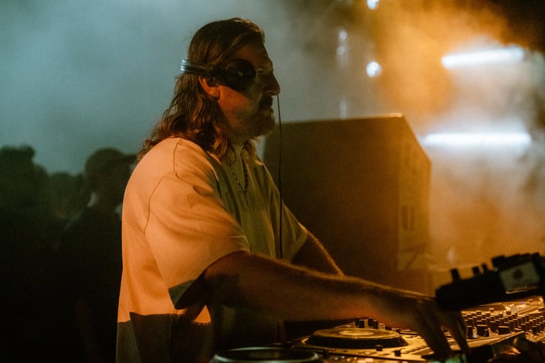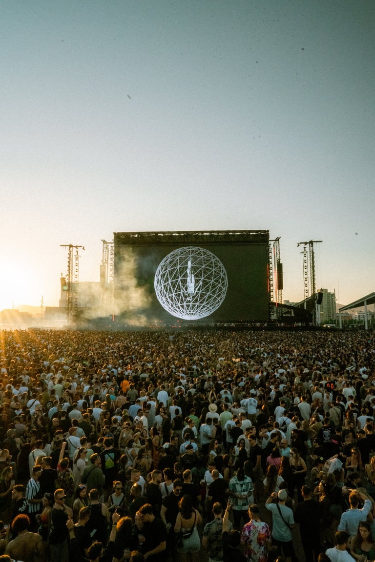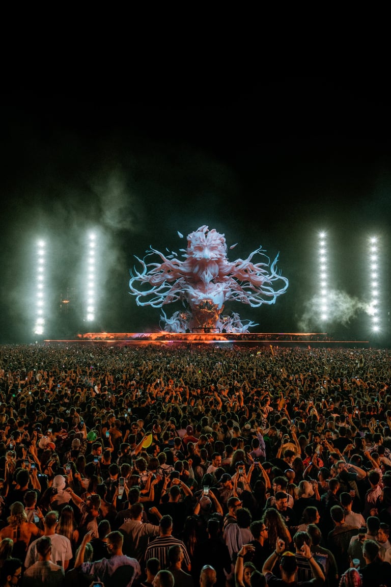 Two DJs performing at Afterlife, Anyma, Tale of Us. Stage lit with visual effects. Concert atmosphere