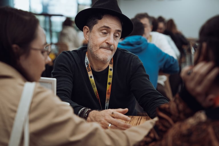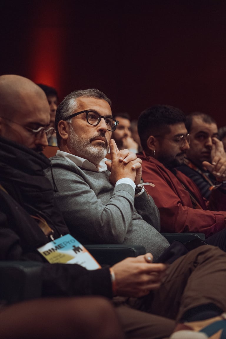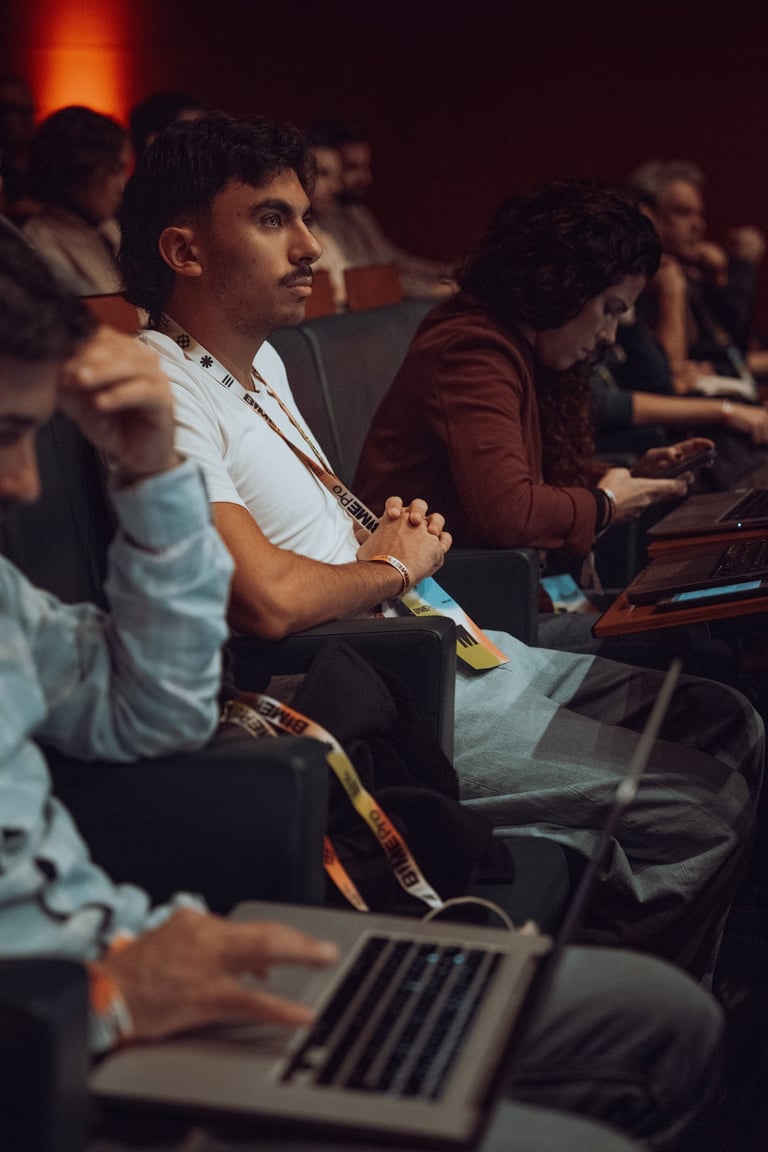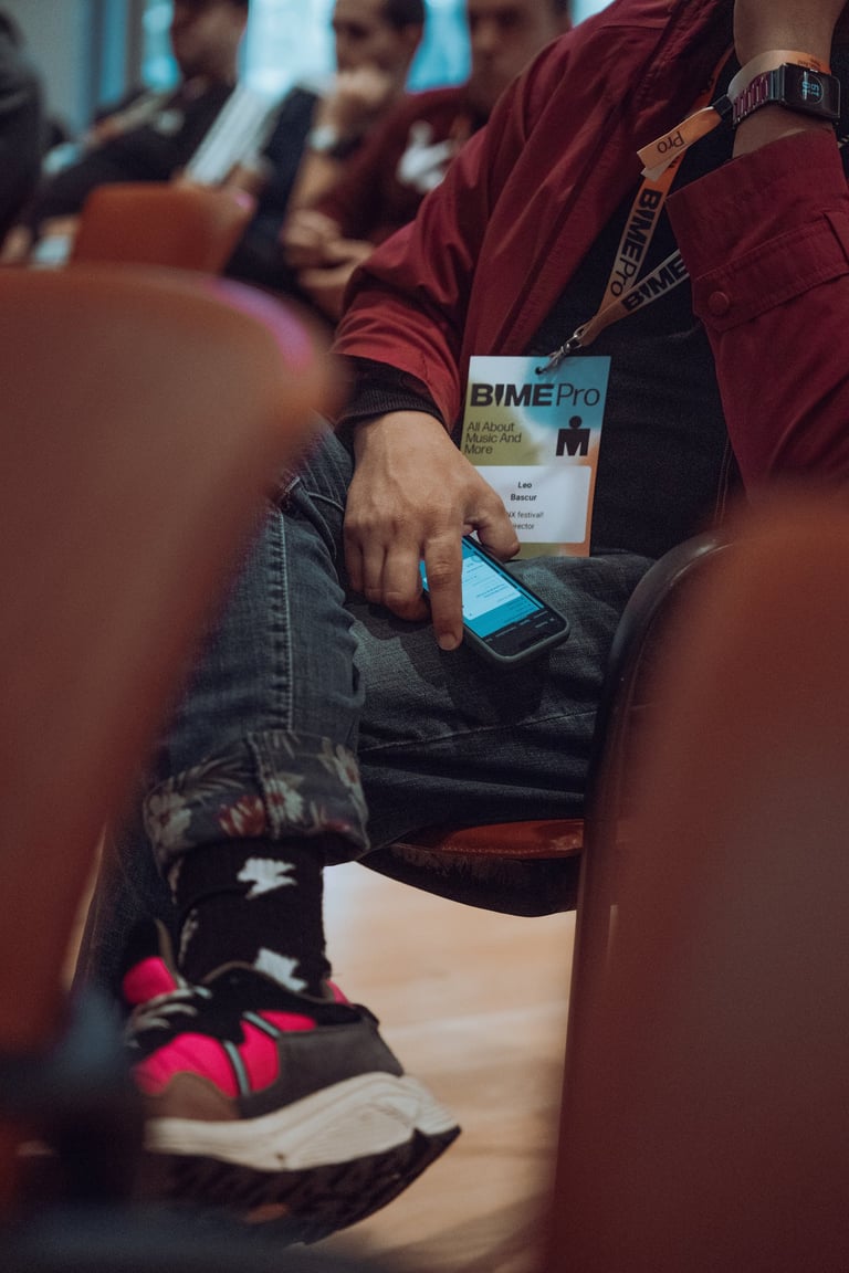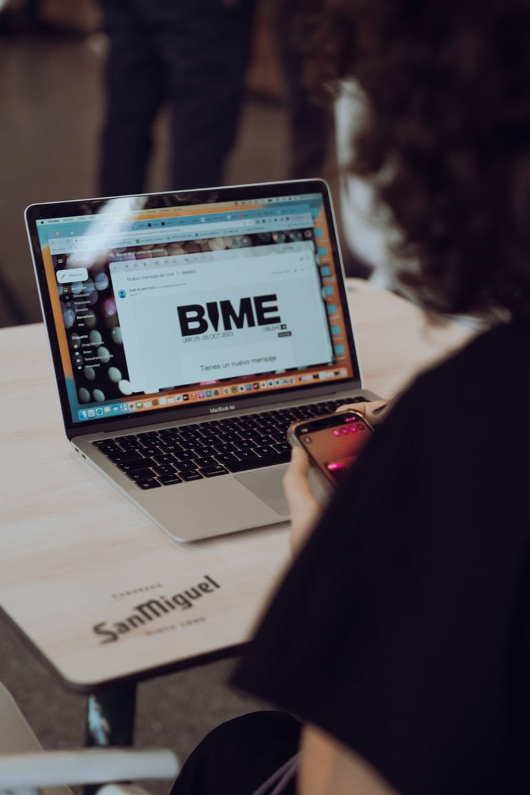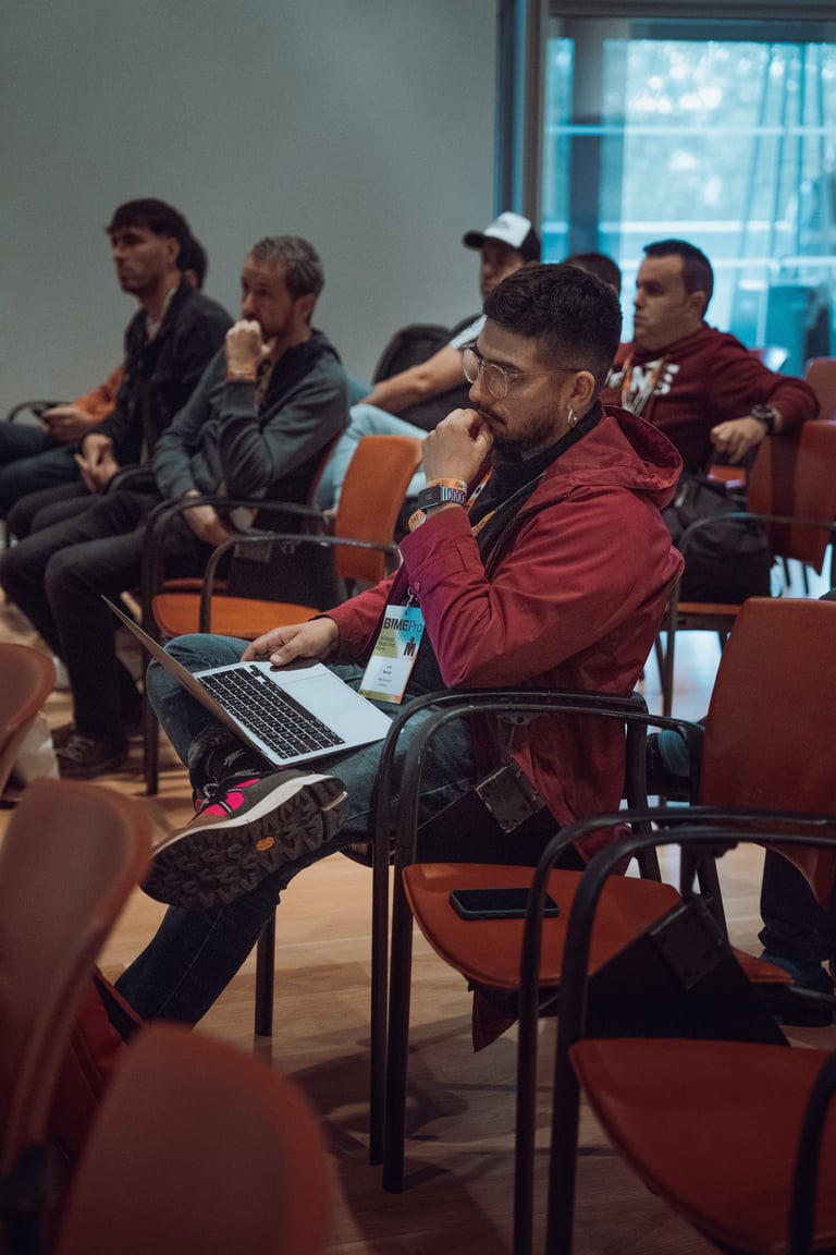 Speaker with a BIME lanyard presenting to an audience at BIME Bilbao. Screen displaying a video. Conference or workshop setti