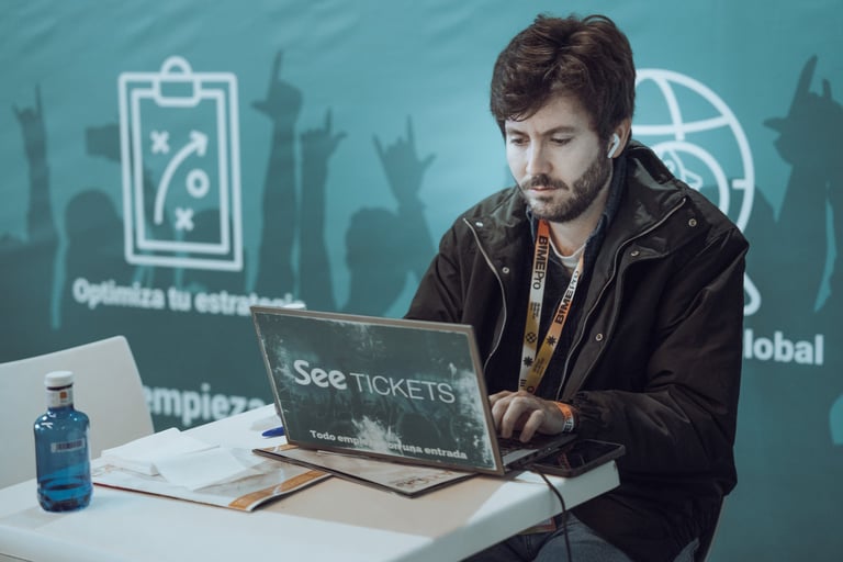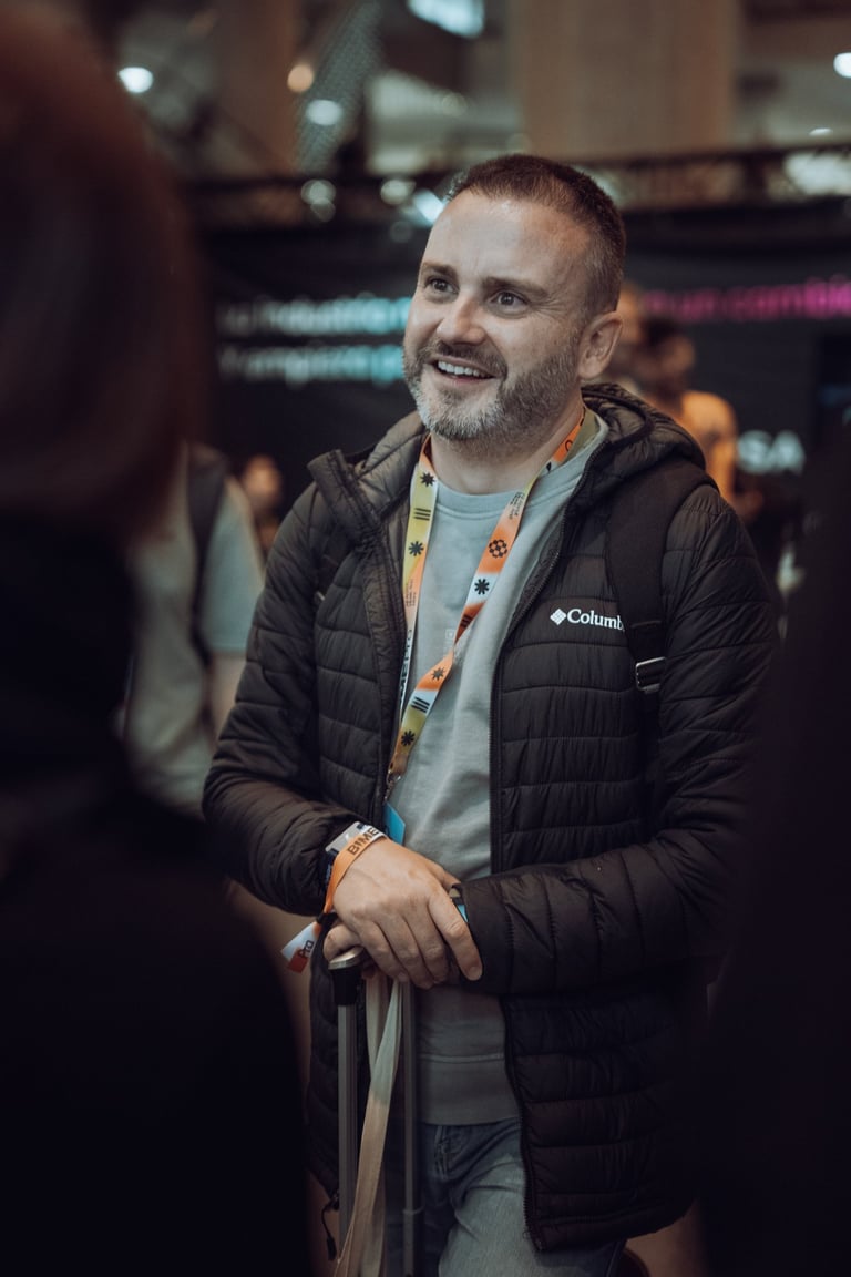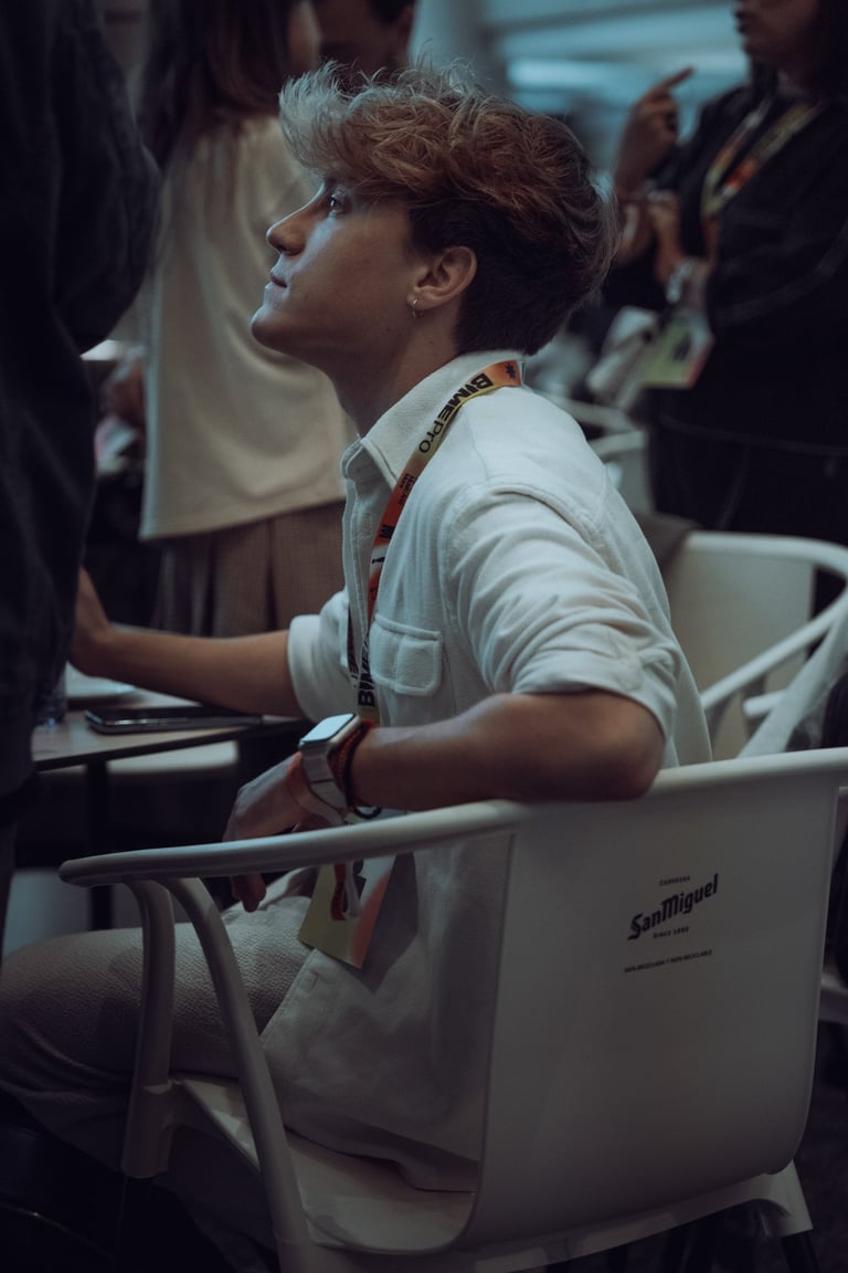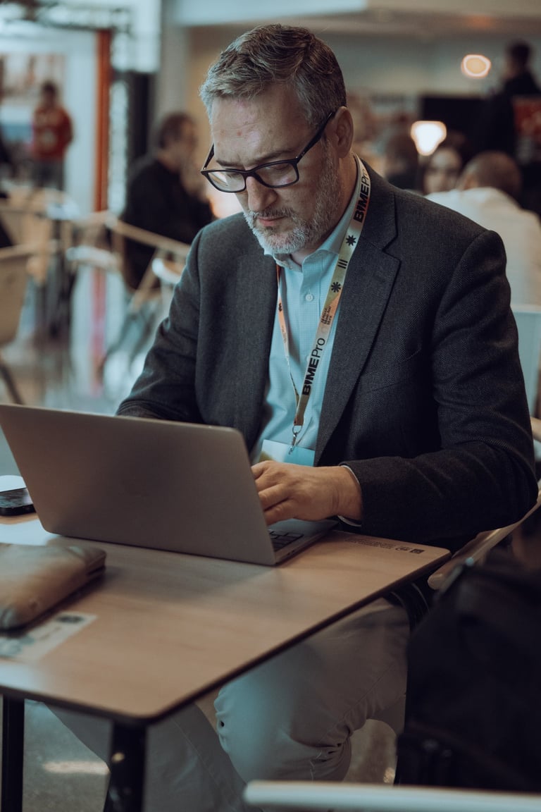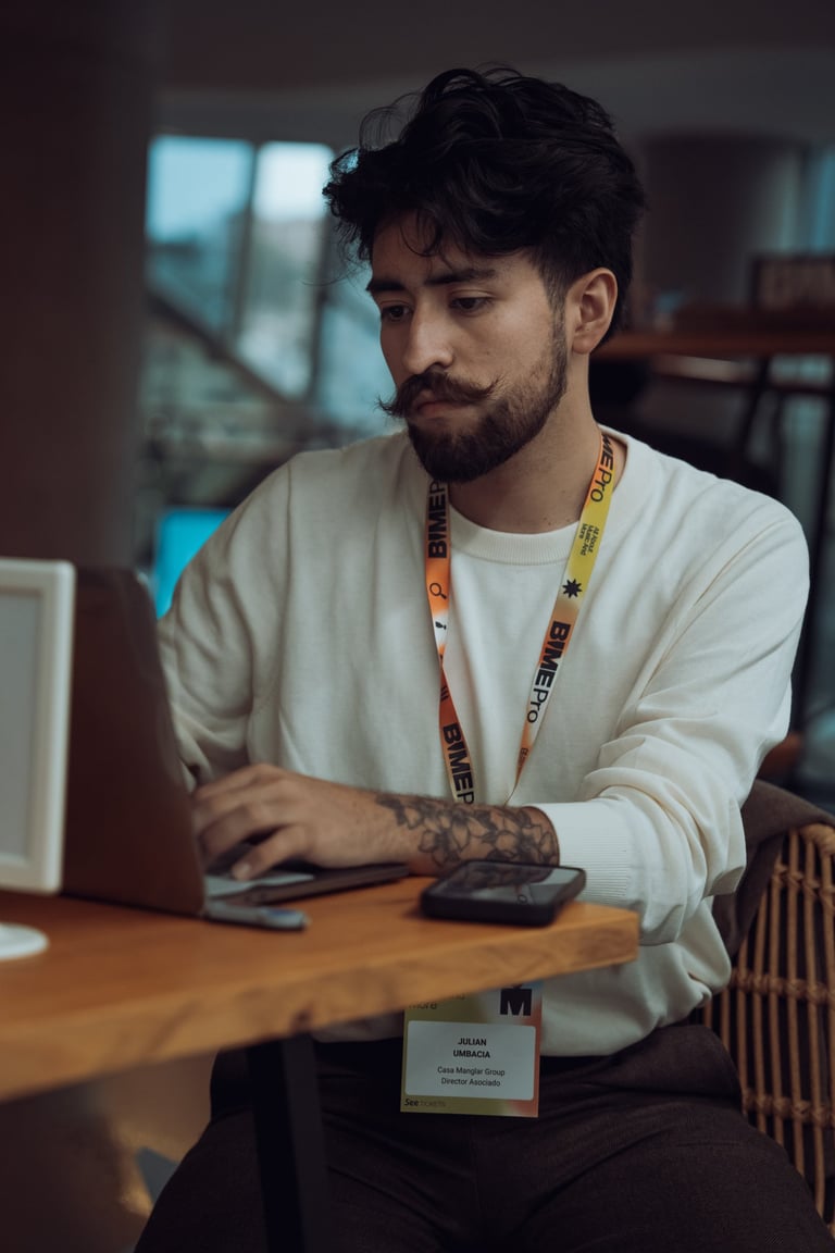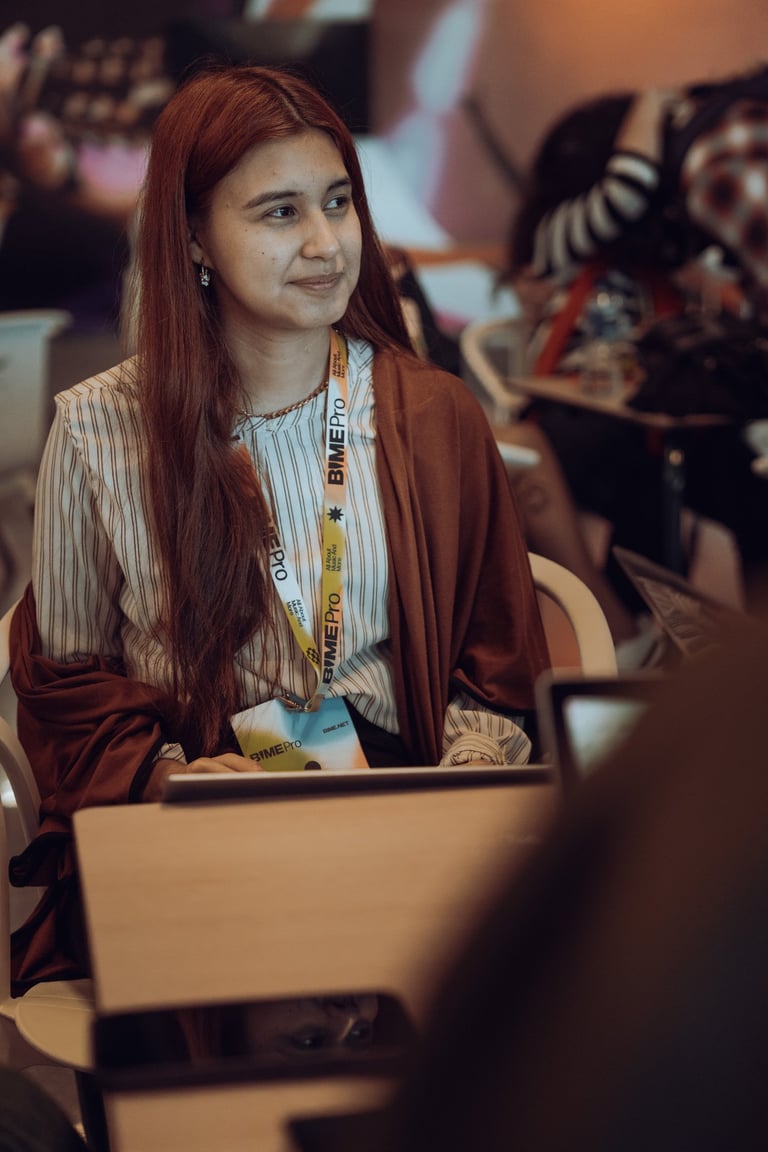Speaker with a BIME lanyard presenting to an audience at BIME Bilbao. Screen displaying a video. Conference or workshop setti