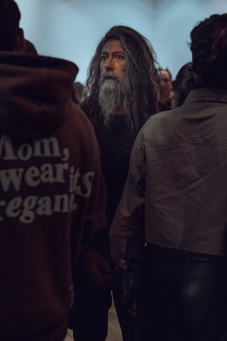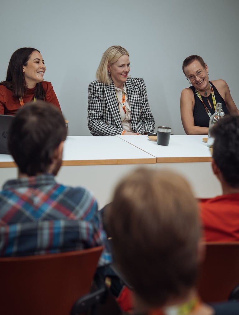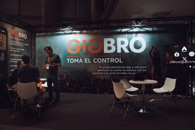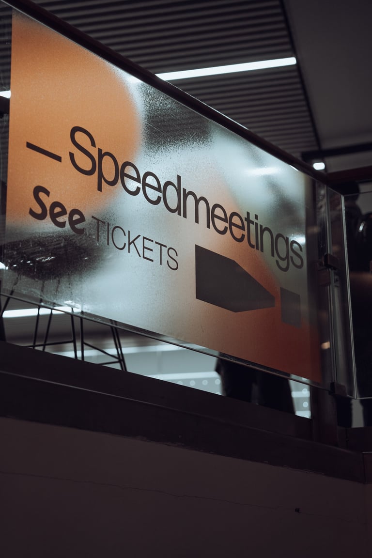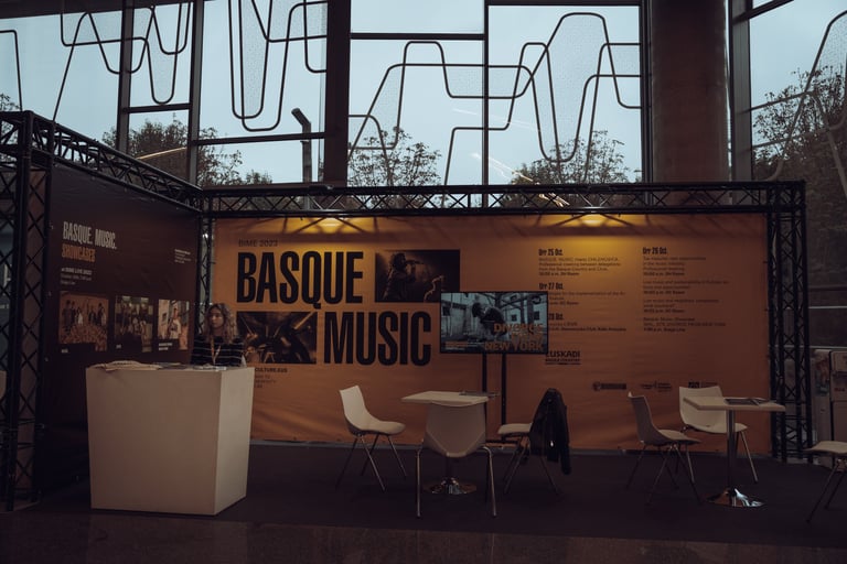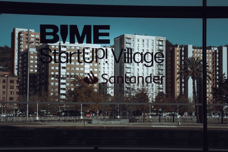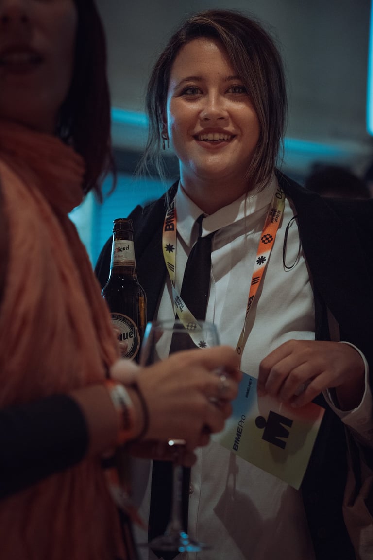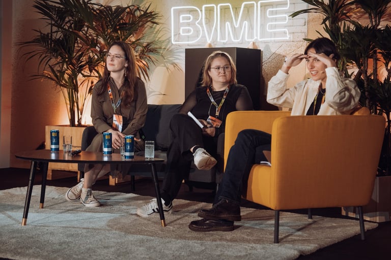 Three women in a relaxed conversation at BIME Bilbao. Neon "BIME" sign and plants in the background. Informal discussion sett