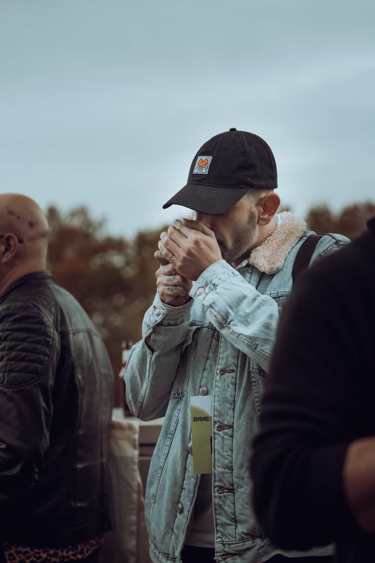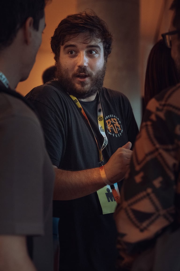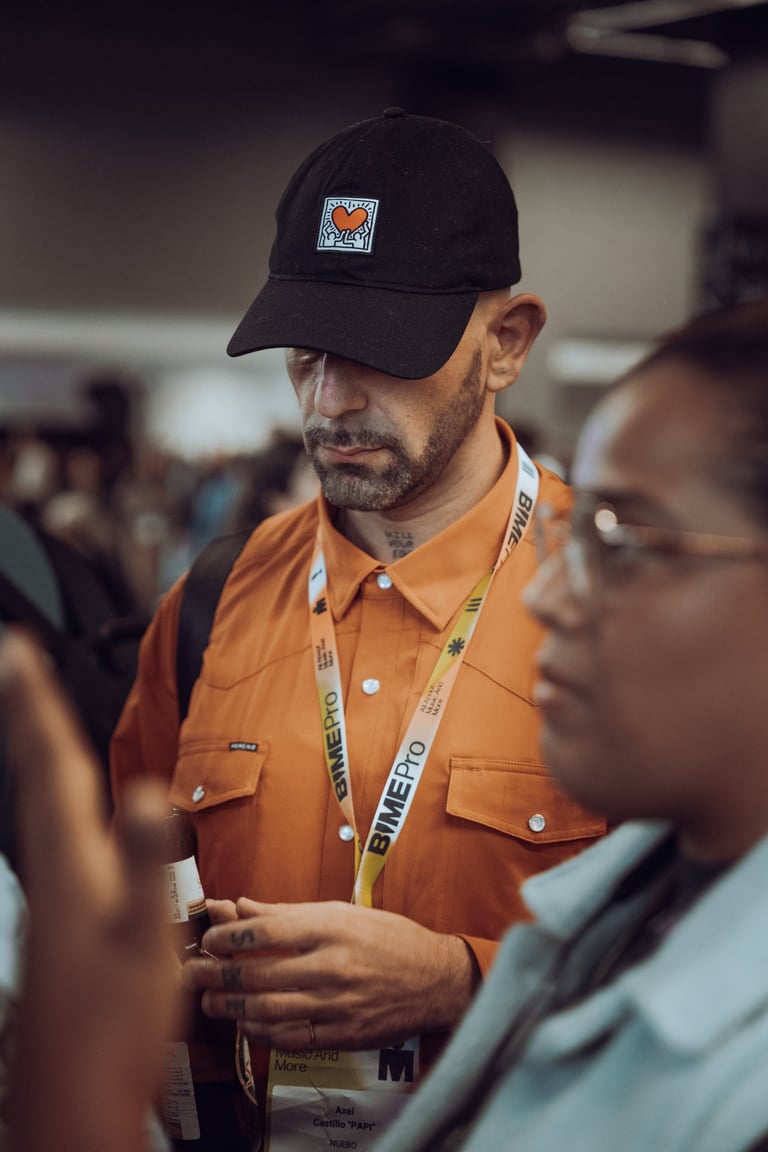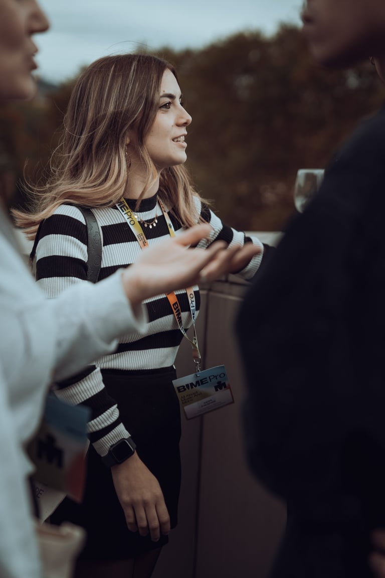 Man with curly hair wearing a BIME Pro lanyard exchanging business cards with two other attendees at BIME Bilbao. Networking